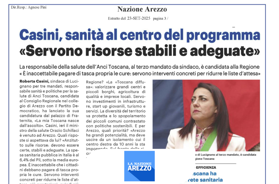 "La mia Toscana nasce dall'ascolto". Con queste parole Roberta Casini, sindaca di Lucignano al terzo mandato e responsabile sanità di ANCI Toscana, ha presentato la sua candidatura al Consiglio Regionale nel collegio di Arezzo dal palazzo di Fraternita. In un'intervista esclusiva pubblicata su La Nazione di Arezzo il 23 settembre 2025, la candidata del Partito Democratico ha delineato il suo programma incentrato sulla sanità pubblica, lo sviluppo territoriale e le infrastrutture.
